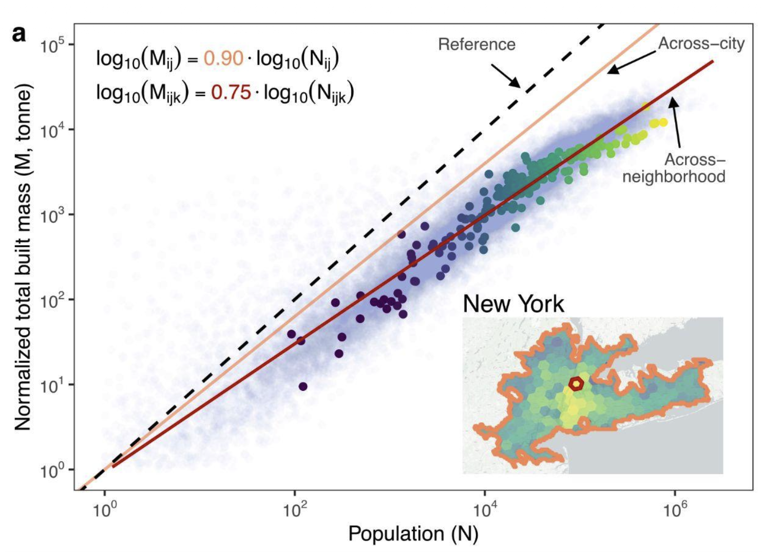 A puzzle hiding in plain sight Imagine two cities. City A has one million people. City B has two million. Instinctively, we assume City B needs twice as much stuff: twice the buildings, twice the roads, twice the concrete, twice the everything. But when we actually measured the total mass of buildings, roads, and pavement across 3,000 cities worldwide , we found something weird. Doubling the population does not double the material. Thanks for reading! Subscribe for free to receive new posts and support my work. It only increases it by about 87% . In other words, the two-million city uses 6.5% less per person than the one-million city. (Detailed math: (200% – 187%) / 2 = 13% / 2 = 6.5%) That’s the puzzle. Why does a bigger city weigh less per human than a smaller one? The hidden pattern: ci