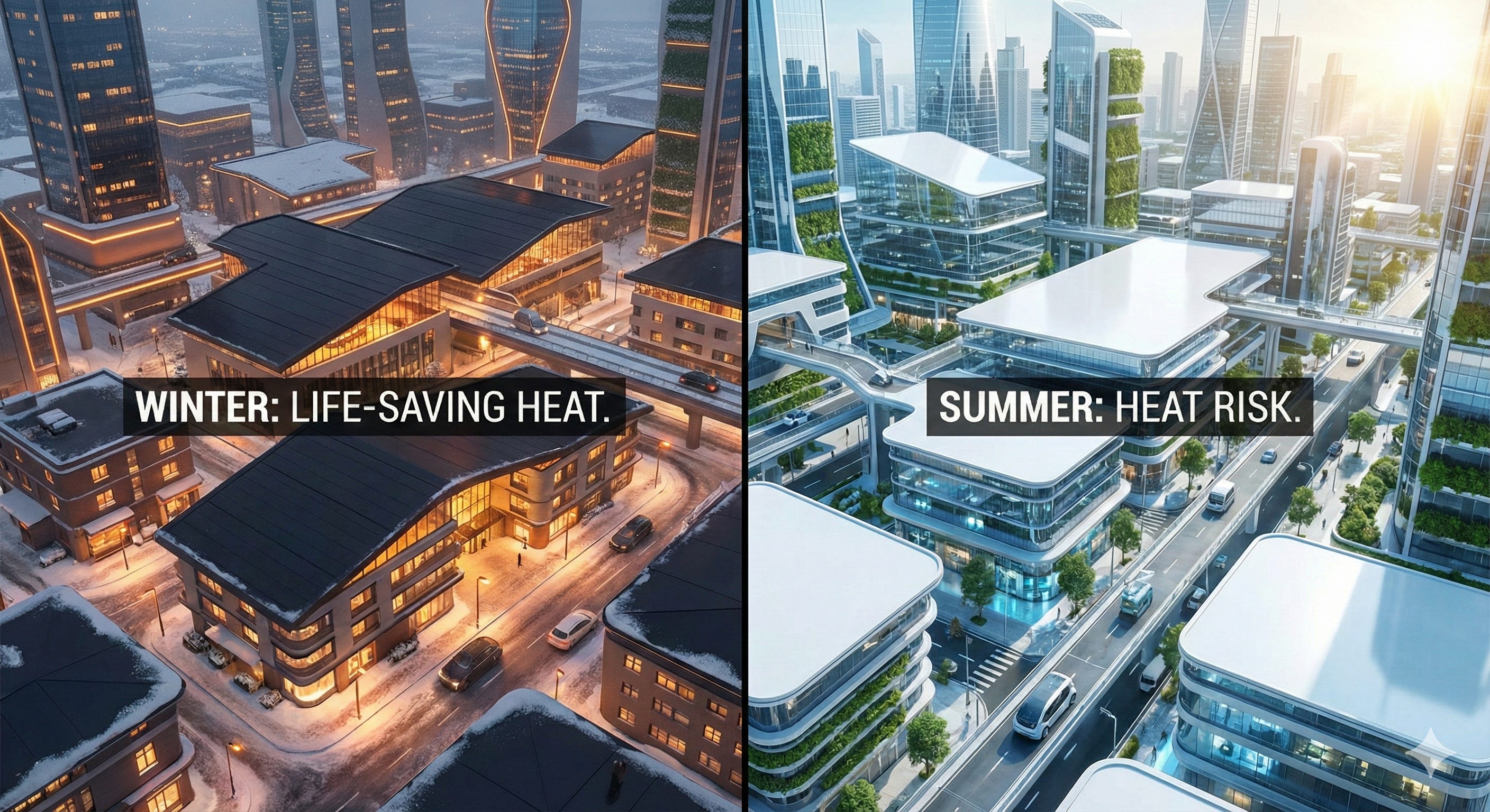 Imagine a city on a freezing January morning. The skyscrapers glow faintly in the dusk. The asphalt radiates back the heat it stored the day before. Downtown is a few degrees warmer than the outskirts. We’ve given this phenomenon a villain’s name: the Urban Heat Island . You already know the narrative. Cities are too hot. Urbanization worsens heat stress. Climate change turns concrete into a slow oven. All of that is true. But here’s the part almost no one knows— urban heat also saves lives . A lot of them. The core problem is not cooling—it’s static cooling . Cities cool themselves the same way year-round, even when the temperature swings across a massive deadly gap. But what if our approach was dynamic? Our study experimented with a seasonally adaptive albedo strategy : Higher albedo in